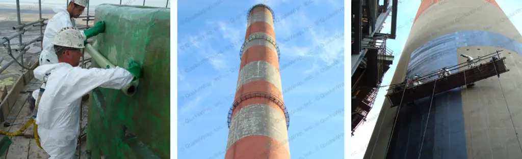 Strengthening of smokestacks and chimneys is often required due to structural modification. As an example, the US government has mandated many industrial plants to install a Selective Catalytic Reduction System (“SCR Scrubber System”) to reduce their harmful emissions. This system requires cutting an opening in the side of the chimney for installation of new ductwork. Furthermore, smokestacks and chimneys often require repair and/or strengthening due to corrosion of reinforcing steel and general deterioration of materials. In these cases, FRP offers a very fast and cost-effective repair alternative.